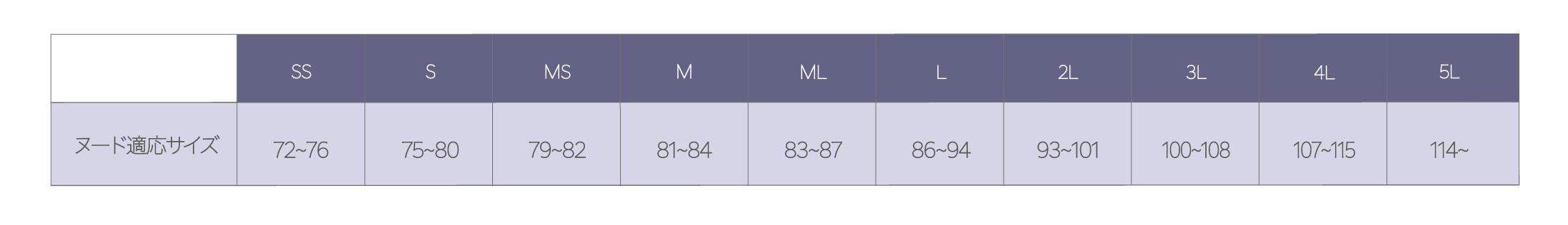 下記に記載されているヌード寸法を参考に、お客様の体型に合ったサイズをご確認いただけます。